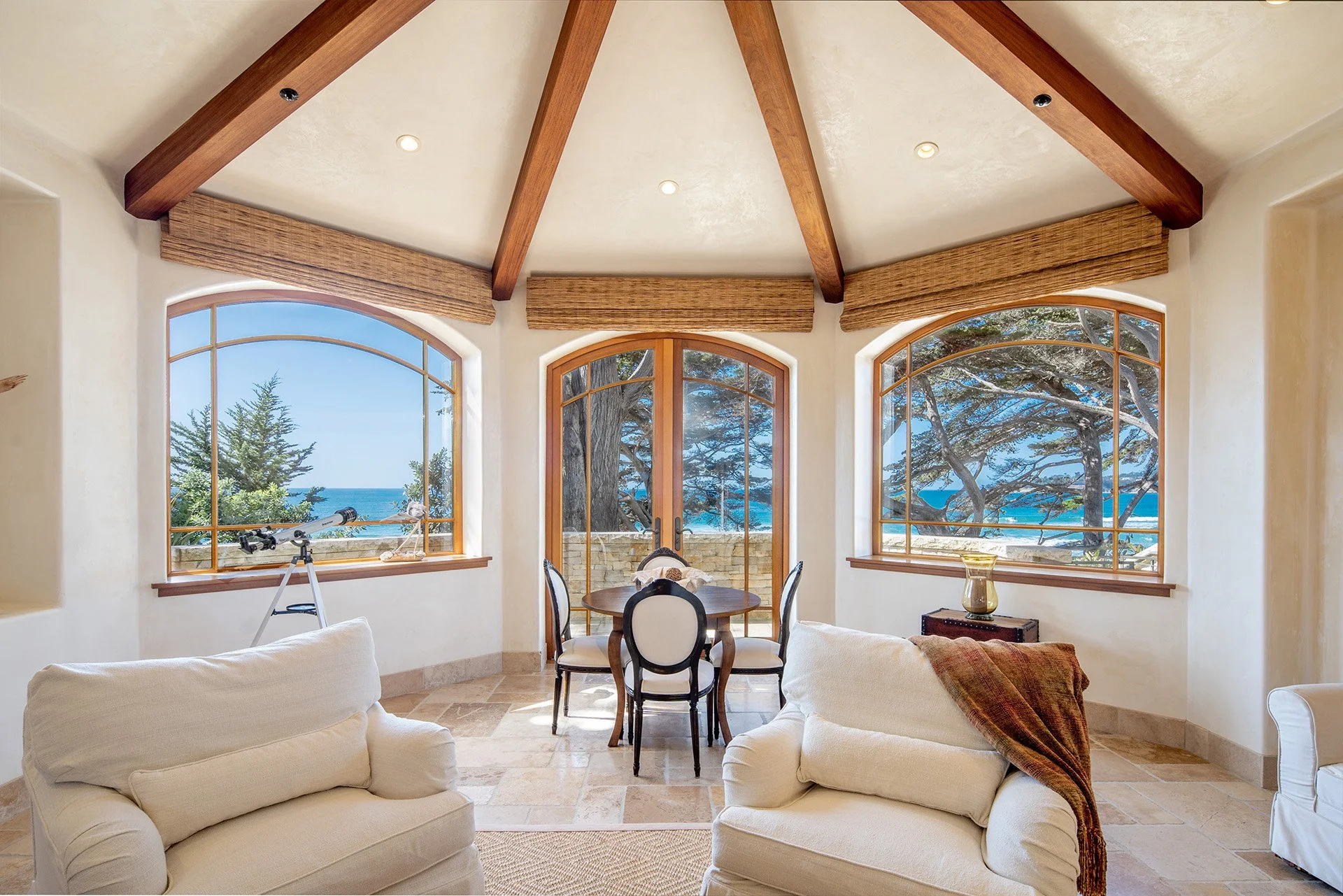 Set along Carmel's iconic Scenic Road, this Mediterranean-inspired home enjoys sweeping, front-row views of white sand and rolling surf, offering a rare vantage point on one of the world's most celebrated coastlines. Arched windows in the living room, dining room, and kitchen, frame California sunsets in a way that feels both cinematic and intimate. A discreetly tucked-away pool, wine room, private elevator, five fireplaces, and an outdoor firepit come together to create an unmatched coastal lifestyle.